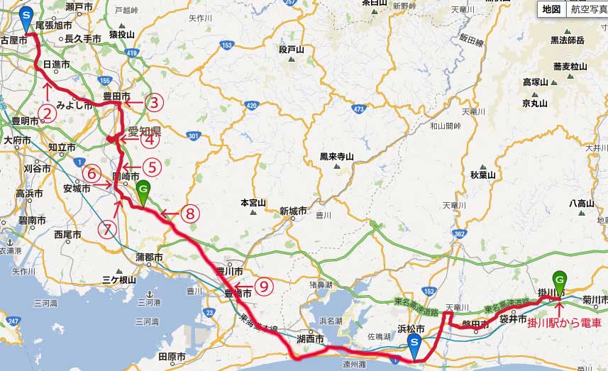『ここまで67km。5時間 沼津まで168km。このままのペースで16時間ぐらいか… 疲れた所でストップやな 掛川まで70km…そんくらい』